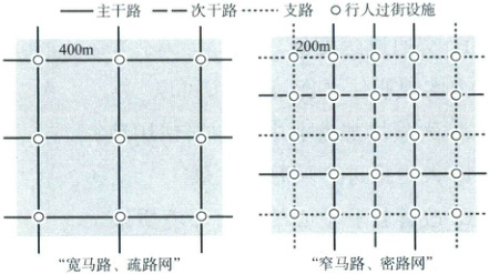 1 D 【解析】本题考查城市空间布局的影响。读图可知,与“宽马路、疏路网”相比,“窄马路、密路网”主干路较少,行人过街设施多,路网密度大,路网通达度高,A、B、C错误,D正确。