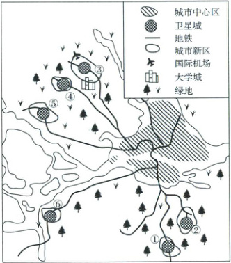 (2)市中心就业岗位多,工资水平高;卫星城居住成本较低,环境优美;市中心与卫星城之间交通便利。(6分)