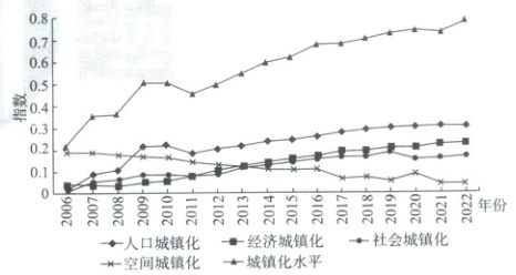 (1)城镇化水平总体上升;人口城镇化、经济城镇化、社会城镇化水平上升,空间城镇化水平降低;2022年人口城镇化水平最高,空间城镇化水平最低。(6分)