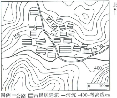 [北京大学附属中学 2025 高一期末]于家村位于太行山东麓,其古民居为石墙瓦房,墙体厚实。近两年当地民俗旅游逐渐兴起。下图为于家村民居分布图。据此完成下题。