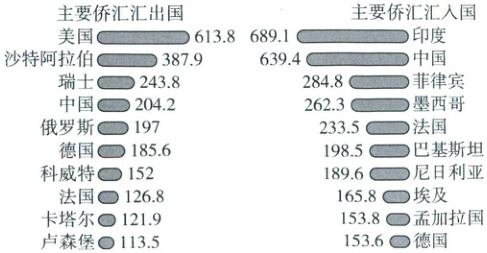 [重庆八中 2024 高一月考]下图示意《世界移民报告 2018》中关于世界侨汇(即移民汇款)汇入国和汇出国前十名的年汇款情况(单位:亿美元)。