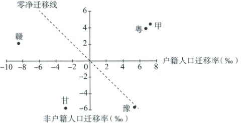 1.A 【解析】本题考查读图分析能力。户籍人口迁移指的是迁移人口常住地的变动伴随着户籍地的变动,非户籍人口迁移指人口发生迁移,但户籍并未随之迁移。甲户籍人口迁移率和非户籍人口迁移率均为正值,说明经济发达、就业机会多,吸引力大,浙江符合,A正确;与浙(浙江)相比,鄂(湖北)、滇(云南)、吉(吉林)经济发展水平不高,对人口的吸引力不强,B、C、D错误。 2.B 【解析】本题考查人口迁移的含义及成因。江西户籍人口迁移率为负值,说明因经济发展缓慢,户籍人口大量迁出,①正确;但非户籍人口迁移率为正值,可能是受产业转移影响,吸引劳动力迁入,④正确;相较于东南沿海省份,江西经济不发达,户籍人口所享受的社会福利低,即便户籍政策宽松也难以吸引外来人口迁入落户,同时非户籍人口迁移率为正值,即迁入的人口并未落户,②错误;交通网络完善会影响人口迁移,既可能促使人口迁入,也可能加速人口迁出,③错误。综上,①④正确,故选B。