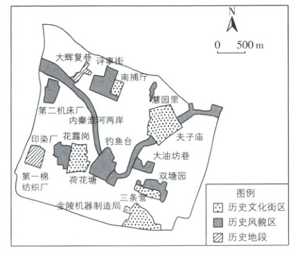 [安徽 2025·6~8]老城南地区位于南京市内城南部,经过持续更新改造,已成为城市新名片。下图示意老城南地区历史要素的空间分布,下表为老城南地区四种更新方式及案例。据此完成下面小题。