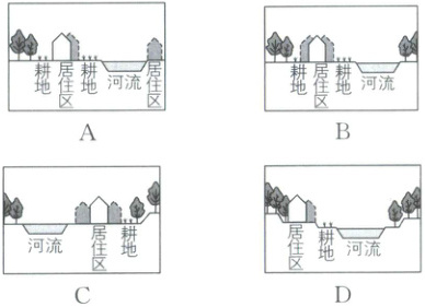 该图从左到右依次是山地、居住区、耕地、河流、山地,与图文材料不符 D 错误