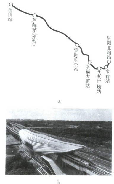 [吉林长春外国语学校2025高一期中]成都市域铁路S3线(以下简称“S3线”)是连接成都地铁18号线福田站与高铁资阳北站的一条轨道交通线。全线长约39.37千米,“地下+高架”路段占比约90%,其中地下段长约9.77千米。S3线实行地铁化运营,在福田站同站换乘,不用重新过闸机。图a为S3线路图,图b为S3线某站点景观图。据此完成下面小题。