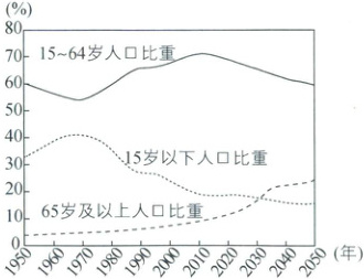 3.D【解析】本题考查读图分析能力。从图中数据分析可知,2020年65岁及以上人口比重在10%~20%,A错误。2020年后15岁以下人口比重呈下降趋势,表明出生率呈下降趋势,B错误。2035—2050年劳动人口比重仍然超过50%,说明2035年后短期内非劳动人口少于劳动人口,C错误。2035年后劳动人口比重继续下降,D正确。