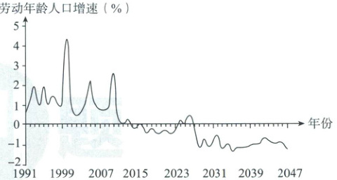 ▶▶创新优题[河南信阳高级中学 2024 高一月考]人口机会窗口期是人口年龄结构有利于经济发展、劳动力供给充足、人口抚养负担相对较轻的一段时期。下图为我国 1991—2047 年劳动年龄人口增速变化图(含预测)。面对我国劳动年龄人口变化形势,较发达城市正在积极实施“积分入户”政策,“积分入户”指外来人口取得政策规定分值后即可申请落户,是迁入地促进外来人口融入的有效方式。据此完成下面小题。