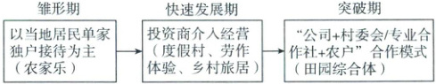 (1)本题考查服务业发展特征。读图可知,雏形期以当地居民单家独户接待为主(农家乐),以当地居民为主要参与者,通过单家独户接待,传承乡村文化,保留乡村原始景观,开发程度低;雏形期乡村旅游规模不大,以小规模的“农家乐”为主,居民初期投入资金少,经营规模小、成本低,难度小;经营形态相对单一,以餐饮和住宿为主,市场竞争力不强,经济效益不高。【特征分析类】