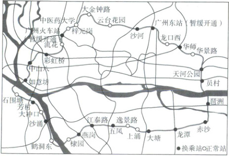 [湖北襄阳四中2025高一月考]2024年12月28日,广州首条地铁环线11号线正式开通。该环线途经多个核心城区和交通枢纽,设31座车站。环线建设需攻克岩溶塌陷、历史建筑保护等难题,并采用GIS技术提高施工效率。下图示意广州地铁11号线站点。据此完成下面小题。