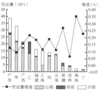 | 乙 | 以铁路和公路为主,几乎无水路,货运量增速较大 | 乙以铁路和公路为主,几乎无水路,货运量增速较大,说明之前货运量较少,现在有较大的增加,与内蒙古情况基本符合 | B正确 |