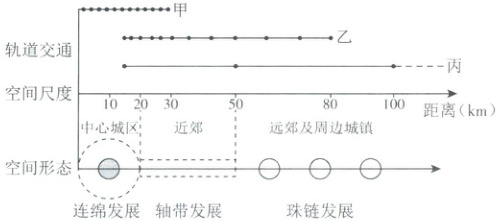 [浙江 2024年1月·5~6]下图为我国某都市圈轨道交通与城市空间形态关系示意图。完成下面小题。