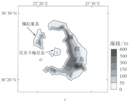 [山东 2024·11~12]锡拉岛位于地中海,整个岛屿被厚厚的火山岩和火山灰覆盖,夏季岛上北风频发。约3600年前的古锡拉岛是一个圆形的大岛(范围包括现在的锡拉岛和附近小岛,以及这些岛屿之间的海域),后来演变成环形群岛,其中最大的岛屿为锡拉岛(图a)。锡拉岛的西部葡萄种植历史悠久,当地农民在管理葡萄时将葡萄藤盘成圆形的篮子状(图b),并将葡萄果实置于“篮子”内生长。据此完成下面小题。