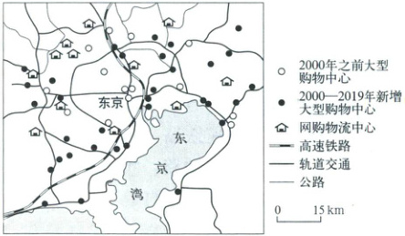 【解析】(1)本题考查地理事物的空间分布变化特征。依据材料“进一步促使大型商业设施(大型购物中心和网购物流中心等)在东京都市圈外围地区开设”,并对比图中2000年之前大型购物中心和2000—2019年新增大型购物中心的分布可知,总体上2000年之后大型购物中心的数量明显增多,分布范围也明显扩大;局部来看,东京都市圈最核心的中心城区新增的大型购物中心数量少,外围地区新增的大型购物中心数量多;从布局来看,大型购物中心在交通线附近的分布更加密集,呈现由中心城区向外围地区扩散的趋势。