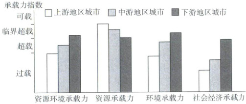 [天津重点校2025高一联考]长江经济带发展已经上升为国家战略,推动长江经济带发展,前提是坚持生态优先,关键是要处理好绿水青山和金山银山的关系。实际上长江经济带面临着较为严峻的生态环境压力。下图为长江经济带上、中、下游地区城市各项承载力指数对比图。据此完成下面小题。