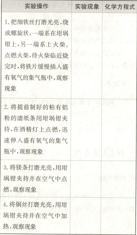 1. 实验用品:铁丝、镁条、铜丝、铝粉、体积相同的多瓶氧气;坩埚钳、酒精灯、陶土网、火柴、集气瓶、砂纸。