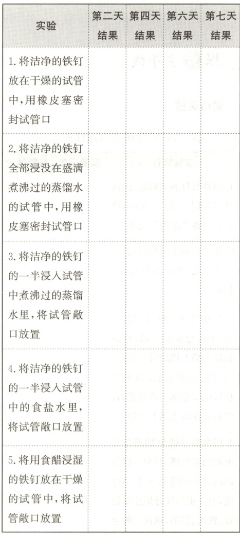 提示:本实验需提前一周做,每隔一定时间观察铁钉(实验前用砂纸打磨干净)的锈蚀情况,将实验现象记录在下表中。