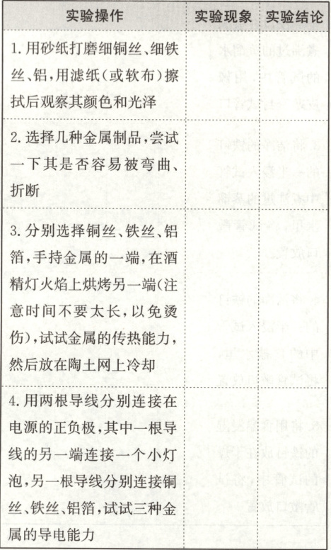 | 1. 用砂纸打磨细铜丝、细铁丝、铝,擦拭后观察颜色和光泽 | 铜丝呈紫红色,铁丝、铝呈银白色,均有金属光泽 | 金属具有金属光泽 |