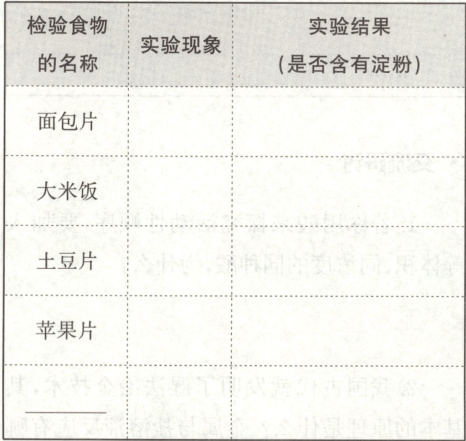 | 检验食物的名称 | 实验现象 | 实验结果(是否含有淀粉) |