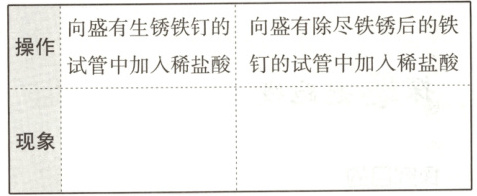 2. 向盛有生锈铁钉的试管中加入少量稀盐酸,观察现象;待铁锈除尽后再加入少量稀盐酸,观察现象。