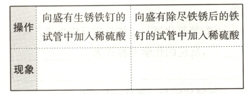 实验步骤与记录 1. | 操作 | 稀硫酸中滴入紫色石蕊试液 | 稀硫酸中滴入无色酚酞试液 | |--------------------------|--------------------------|--------------------------| | 现象 | 溶液变红 | 溶液不变色 | 2. | 操作 | 向盛有生锈铁钉的试管中加入稀硫酸 | 向盛有除尽铁锈后的铁钉的试管中加入稀硫酸 | |-|-|-| | 现象 | 铁锈逐渐消失,溶液由无色变为黄色 | 铁钉表面有气泡产生,溶液由无色变为浅绿色 | 实验结论