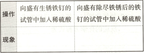 2. 向盛有生锈铁钉的试管中加入少量稀硫酸,观察现象;待铁锈除尽后再加入少量稀硫酸,观察现象。