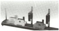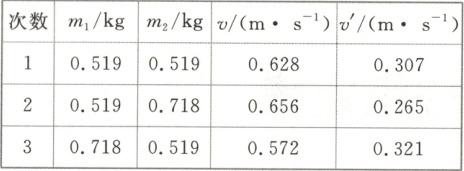 的小车,碰撞后两辆小车粘在一起运动。小车的速度用滑轨上的数字计时器