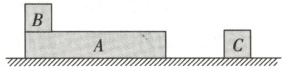 【典例1】 (人教版$P_{30}T_7$改编)如图所示,光滑水平轨道上放置长板 A(上表面粗糙)和滑块 C,滑块 B 置于 A 的左端,三者质量分别为$m_A = 2 kg$,$m_B = 1 kg$,$m_C = 2 kg$。开始时 C 静止,A、B 一起以$v_0 = 5 m/s$的速度匀速向右运动,A 与 C 发生碰撞(时间极短)后 C 向右运动,经过一段时间,A、B 再次达到共同速度一起向右运动,且恰好不再与 C 碰撞。求: