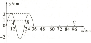 3. (多选)一列横波沿 $ x $ 轴正方向传播,波速为 $ 0.6 m/s $,$ A、B、C $ 为介质中的三个质点。如图为 $ t = 0 $ 时波的图像,$ x $ 轴上质点 $ C $ 的横坐标为 $ 96 cm $,下列选项正确的是