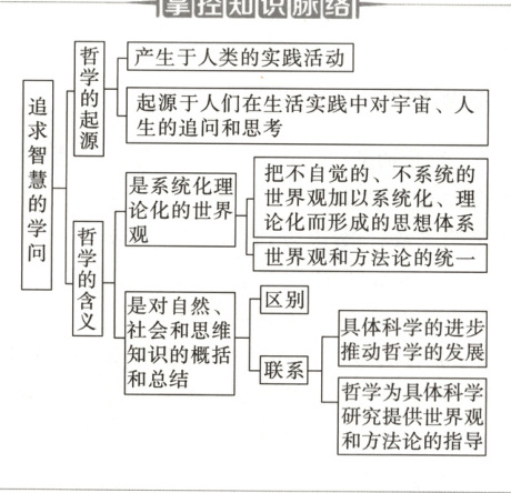1.C [具体科学的进步推动哲学的发展,①说法错误。《周易》记载,“形而上者谓之道,形而下者谓之器”。从“器”中概括出“道”,体现了哲学对具体科学进行概括和升华,从中抽象出最一般的本质和最普遍的规律,②④符合题意。哲学是世界观和方法论的统一,③说法错误。]