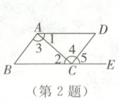 2. 如图,给出下列条件:(1)$\angle B+\angle BAD = 180°$;(2)$\angle 1=\angle 2$;(3)$\angle 3=\angle 4$;(4)$\angle B=\angle 5$.其中能判定$AB// CD$的条件有 (