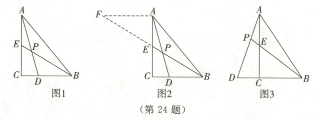 24. (12分)(1)如图1,在$\bigtriangleup ABC$中,$\angle ACB = 90^{\circ}$,$BE$是$AC$边上的中线,点$D$在$BC$边上,$CD:BD = 1:2$,$AD$与$BE$相交于点$P$,请直接写出$\frac{AP}{PD} =$