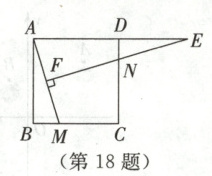 18. (7 分)如图,已知正方形$ABCD$,$M$为$BC$上一点,$F$是$AM$的中点,过$F$作$AM$的垂线,交$DC$于点$N$,交$AD$的延长线于点$E$.