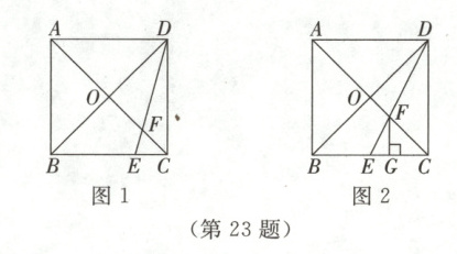 23. (10 分)如图,在正方形$ABCD$中,对角线$AC$与$BD$相交于点$O$,点$E$是$BC$上的一个动点,连结$DE$,交$AC$于点$F$.