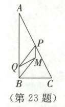 23. (10分)如图,在$Rt \triangle ABC$中,$\angle B = 90°$,$AB = 4$,$BC = 2$,点$P$在$AC$上以每秒$\sqrt{5}$个单位长度的速度向终点$C$运动.点$Q$沿$BA$方向以每秒1个单位长度的速度运动,当点$P$不与点$A$重合时,连结$PQ$,以$PQ$,$BQ$为邻边作$□ PQBM$.当点$P$停止运动时,点$Q$也随之停止运动,设点$P$的运动时间为$t(s)$,$□ PQBM$与$\triangle ABC$重叠部分的图形面积为$S$.