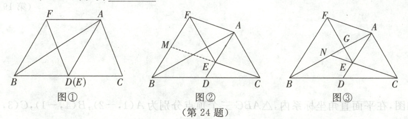 24. (12分)如图,$AD$是$\triangle ABC$的中线,点$E$是$AD$上一点,过点$E$作$AC$的平行线,过点B作AD的平行线,两平行线交于点$F$,连结$AF$.