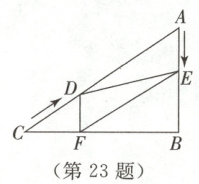 23. (10 分) 如图,在 Rt△ABC 中,∠B = 90°,AC = 60 cm,∠A = 60°,点 D 从点 C 出发沿 CA 方向以 4 cm/s 的速度向点 A 匀速运动,同时点 E 从点 A 出发沿 AB 方向以 2 cm/s 的速度向点 B 匀速运动,当其中一个点到达终点时,另一个点也随之停止运动. 设点 D,E 运动的时间是 t s(0 < t ≤ 15). 过点 D 作 DF ⊥ BC 于点 F,连结 DE,EF.