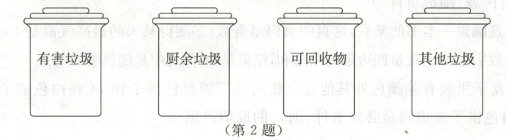 2. 垃圾分类可以把有用的垃圾回收再利用,减少了对环境的危害.随机将一节废旧的电池(有害垃圾)和矿泉水瓶(可回收垃圾)分别放入不同的垃圾桶(如图),则投放正确的概率为