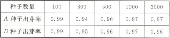 下面有三个推断:①当试验种子数量为100时,两种种子的出芽率均为0.99,所以A,B两种新玉米种子出芽的概率一样;②随着试验种子数量的增加,A种子出芽率在0.97附近摆动,显示出一定的稳定性,可以估计A种子出芽的概率是0.97;③在同样的地质环境下播种,A种子的出芽率可能会高于B种子. 其中合理的是