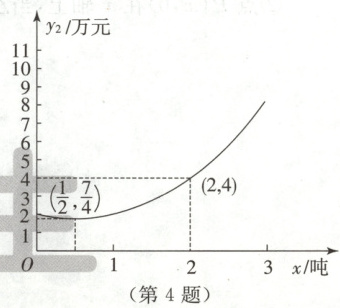 4.(2024 新疆)某公司销售一批产品,经市场调研发现,当销售量在0.4吨至3.5吨之间时,销售额$y_1$(万元)与销售量$x$(吨)的函数表达式为$y_1 = 5x$;成本$y_2$(万元)与销售量$x$(吨)的函数图象是如图所示的抛物线的一部分,其中$(\frac{1}{2},\frac{7}{4})$是其顶点.