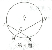 4. 如图,M是$\overset{\frown}{AB}$的中点,过点 M的弦 MN 交 AB 于点 C,⊙O 的半径为 4 cm. 若 MN = $4\sqrt{3}$ cm,则∠ACM =