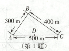 1. 如图,A,B,C 是某社区的三栋楼.若在 AC 的中点 D 处建一个 5G 基站,其覆盖半径为 300 m,则这三栋楼中在该 5G 基站覆盖范围内的是
