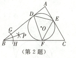 2. 如图,$\triangle ABC$的内切圆(圆心为点$O$)与各边分别相切于点$D$,$E$,$F$,连结$EF$,$DE$,$DF$.以点$B$为圆心,以适当长为半径作弧分别交$AB$,$BC$于$G$,$H$两点;分别以点$G$,$H$为圆心,以大于$\frac{1}{2}GH$的长为半径作弧,两条弧交于点$P$;作射线$BP$.下列说法不正确的是(