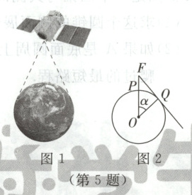5.如图,飞船在离地球大约$330\mathrm{km}$的圆形轨道上,当运行到地球表面$P$点的正上方$F$点时,从中直接看到地球表面一个最远的点是点$Q$.在$Rt\triangle OQF$中,$OP=OQ\approx6400\mathrm{km}$.(参考数据:$\cos16^{\circ}\approx0.96$,$\cos18^{\circ}\approx0.95$,$\cos20^{\circ}\approx0.94$,$\cos22^{\circ}\approx0.93$,$\pi\approx3.14$)
