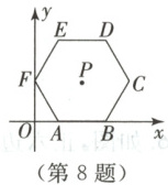 8. 如图,平面直角坐标系中,正六边形$ABCDEF$的顶点$A,B$在$x$轴上,顶点$F$在$y$轴上,若$AB = 2$,求中心$P$的坐标.