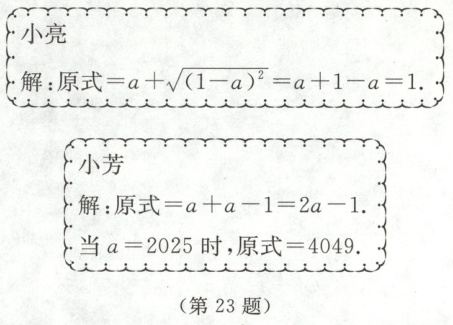 23. (10 分)当 $a = 2025$ 时,求 $a + \sqrt{a^2 - 2a + 1}$ 的值. 如图所示的是小亮和小芳的解答过程: