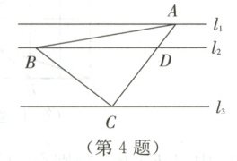 4. 如图,直线$l_1 // l_2 // l_3$,一等腰直角三角形$ABC$的三个顶点$A,B,C$分别在$l_1,l_2,l_3$上,$\angle ACB=90°$,$AC$交$l_2$于点$D$. 已知$l_1$与$l_2$的距离为$1$,$l_2$与$l_3$的距离为$3$,则线段$CD$的长等于