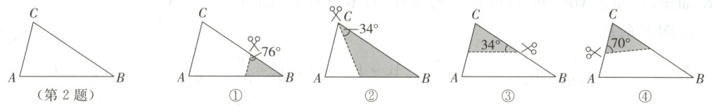 2. [新考法]如图,在三角形纸片ABC中,∠A = 76°,∠B = 34°.将△ABC纸片沿某处剪开,下列四种方式中剪下的阴影三角形一定与原三角形相似的是