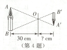 4. 物理课上学过小孔成像的原理,它是一种利用光的直线传播特性实现图像投影的方法.如图,燃烧的蜡烛(竖直放置)$AB$经小孔$O$在屏幕(竖直放置)上成像$A'B'$.若$AB = 36 cm$,$A'B' = 24 cm$,小孔$O$到$AB$的距离为$30 cm$,则小孔$O$到$A'B'$的距离为