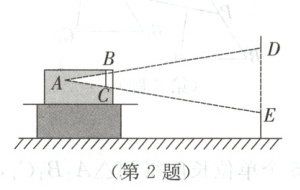 2. 如图所示,一架投影机插入胶片后图像可投到屏幕上.已知胶片与屏幕平行,A 点为光源,与胶片 BC 的距离为 0.1 米,胶片的高 BC 为 0.038 米.若需要投影后的图像 DE 高 1.9 米,则投影机光源离屏幕大约为