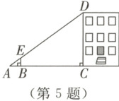5. 如图,利用标杆 BE 测量建筑物的高度.如果标杆 BE 高$1.2 m$,测得$AB = 1.6 m$,$BC = 12.4 m$,楼高$CD$是多少?